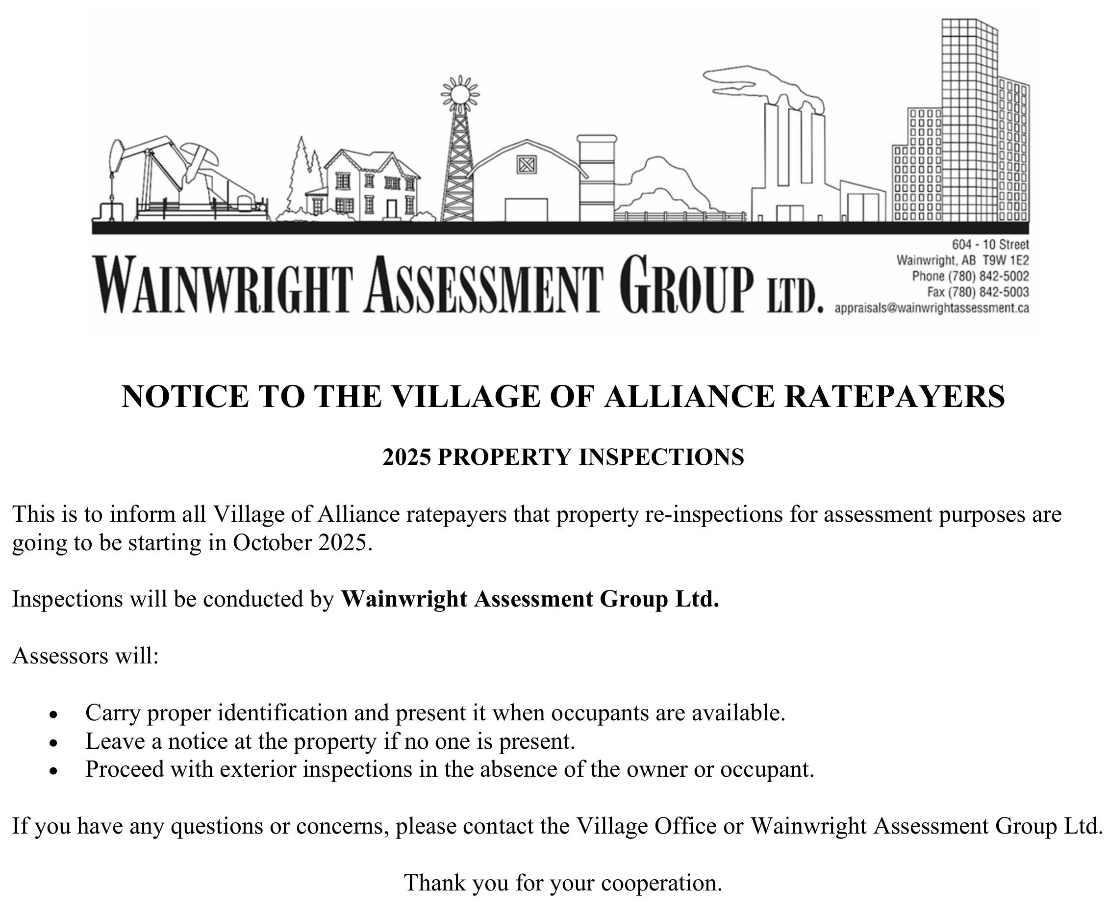 For any questions, contact the Village of Alliance Office at 780-879-3911.