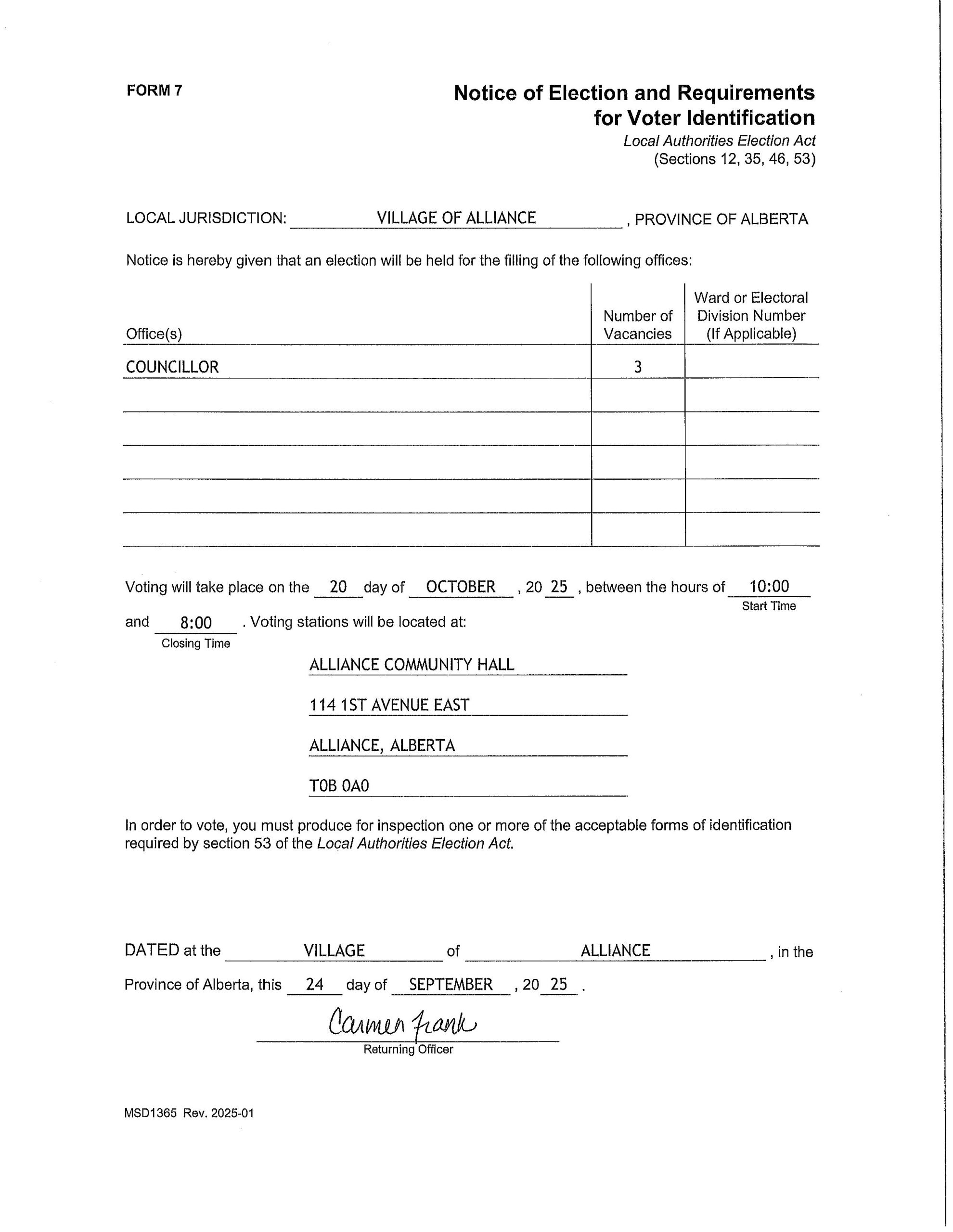 Voters in the Village of Alliance and municipalities across Alberta will go to the polls on Monday, October 20, 2025. The polling station for the Village of Alliance will be at the Community Hall from 10:00 am to 8:00 pm